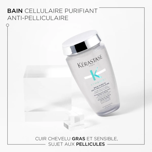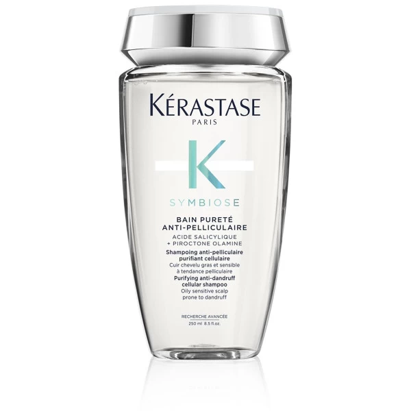 Le Bain Pureté Anti-Pelliculaire Symbiose est idéal pour les cuirs chevelus gras et sensibles, à tendance pelliculaire. C’est un shampooing à triple action :il exfolie instantanément les pellicules et squames visibles du cuir chevelu. Ce shampooing nettoie en profondeur les pores obstrués du cuir chevelu par les cellules mortes et l’accumulation de sébum, le soulageant et limitant les démangeaisons. La fibre est respectée et les pellicules sont éliminées. Grâce à sa formule concentrée en Piroctone Olamine et acide salicylique, le Bain Pureté Anti-Pelliculaire de Kérastase cible les pellicules grasses. La Piroctone Olamine possède des propriétés antifongiques et apaisantes qui permettent de lutter contre les micro-organismes responsables de la formation des pellicules. L’acide salicylique est un actif puissant qui élimine les pellicules présentes sur le cuir chevelu.