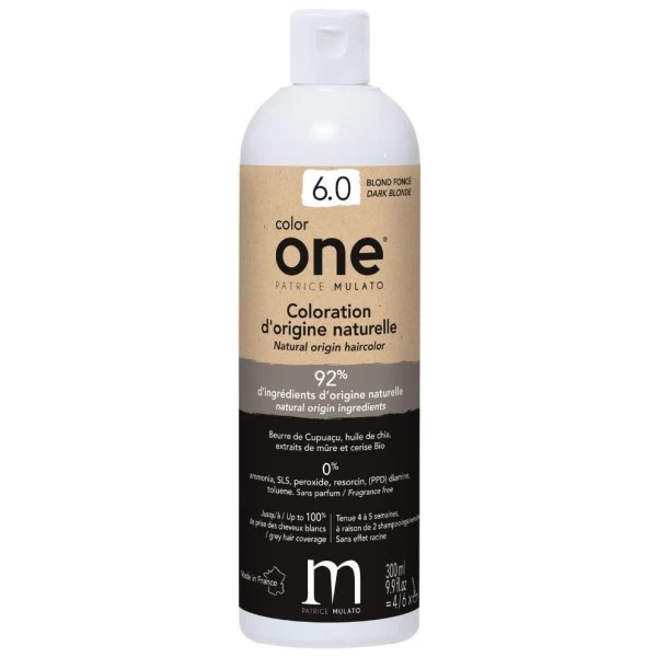 Coloration Color One 6.0 blond foncé Patrice Mulato. Formulée sans agent chimique agressif, Color one® est idéale pour couvrir les cheveux blancs ou pour donner un nouvel éclat à la chevelure. Sa technologie exclusive Natural color process optimise la prise des colorants pour une couleur lumineuse et harmonieuse.