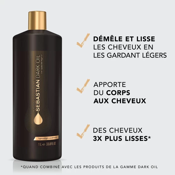 Conditionneur Léger Dark Oil Sebastian Professional, infusé d’un mélange spécial d’huiles d’argan et de jojoba. Il lisse et démêle les cheveux tout en leur offrant volume et légèreté.