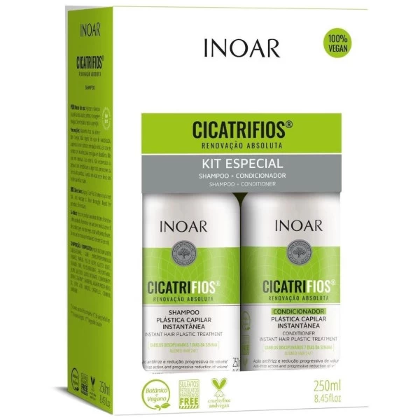 Duo shampooing & conditionneur Cicatrifios Inoar, pour renouveler tous les types de cheveux.