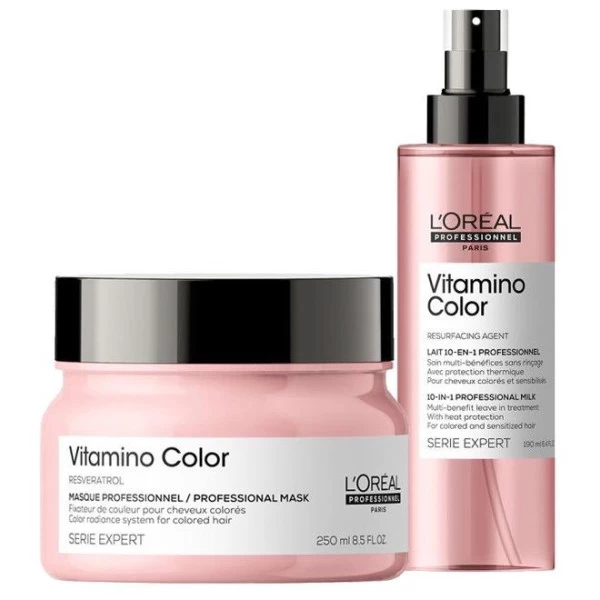 - Spray 10-en-1 Vitamino Color L’Oréal Professionnel, pour des cheveux visiblement plus forts, plus doux, plus brillants et une couleur protégée. Affadissement de la couleur, assèchement du cheveu, sensibilisation… Les services de coloration mettent vos cheveux à rude épreuve. Pour leur venir en aide, L’Oréal Professionnel a formulé le lait 10-en-1 Vitamino Color Série Expert. Fortement concentré en antioxydants, ce soin professionnel protège la couleur et assure à la fibre capillaire un niveau d’hydratation optimal. Dites adieu aux cheveux cassants et aux pointes fourchues, redonnez de la vitalité à vos cheveux en un seul geste. Pour faciliter de coiffage, dompter sa chevelure ou en finition brillant, le lait 10-en-1 va devenir votre meilleur allié.