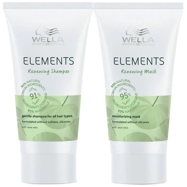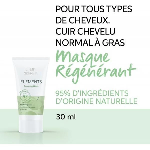 - Masque Renewing Elements de Wella Care, formulé à 95% d’ingrédients d’origine naturelle. Le masque hydratant Renewing Elements de Wella Professionals est adapté à tous les types de cheveux, du cuir chevelu normal à gras. Il assure douceur et lumière pour des cheveux sains et rayonnants. Ce véritable soin hydratant renforce les cheveux dès la première utilisation. La chevelure est brillante et douce au toucher. Plus faciles à coiffer, les cheveux sont disciplinés. Recyclable. Parfum labelisé clean