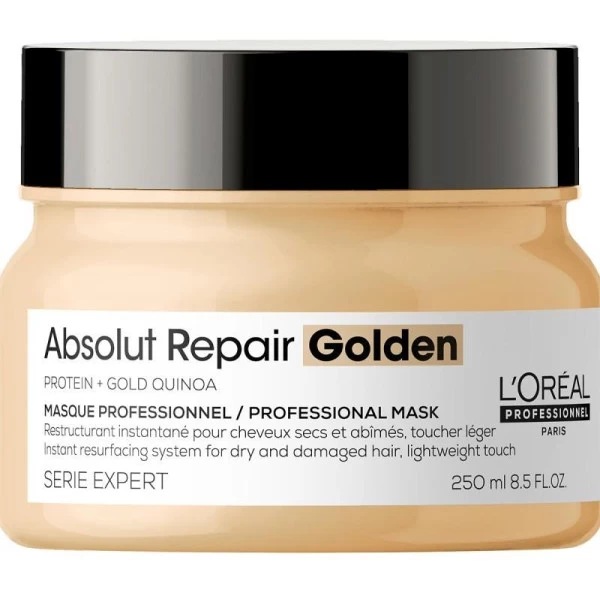 Masque gold Absolut Repair Gold L’Oréal Professionnel, pour que les cheveux secs et sensibilisés retrouvent force, douceur et brillance.
