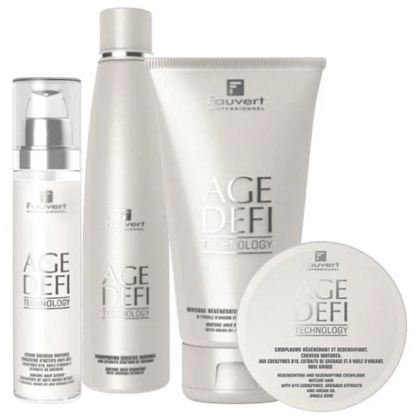 Cataplasme régénérant Age Défi Technology – Fauvert Professionnel. Ce cataplasme exclusif régénère en profondeur et redensifie les cheveux en perte de substance et de vitalité. Sa formule aux coenzymes Q10+, aux extraits de grenade et à l’huile d’argan permet une régénération puissante et profonde du cheveu, mais aussi du cuir chevelu.
