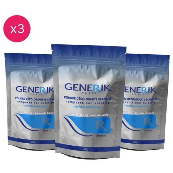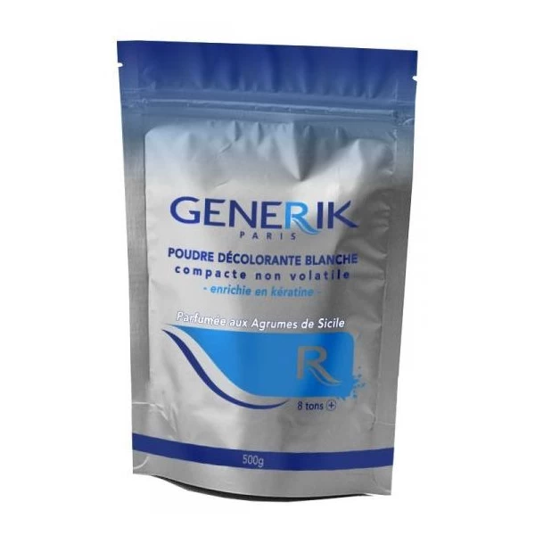 Poudre décolorante Kératine Générik, poudre qui compense la perte de Kératine dans le cheveu et renforce sa surface en offrant une brillance intense et un blond lumineux.