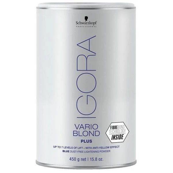 Igora Vario Blond Plus – Poudre compacte décolorante bleue de Schwarzkopf Professionnel. Poudre décolorante non volatile pour réussir des blonds superbes même à partir de bases foncées. Éclaircissement jusqu’à 7 tons avec un soin à l’amidon de blé et pas d’odeurs désagréables (le produit est légèrement parfumé).
