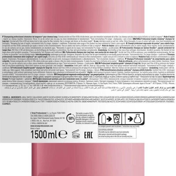 Shampooing Pro Longer L’Oréal Professionnel, pour rénover la fibre capillaire des cheveux longs et lui donner plus de force et de brillance.