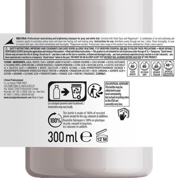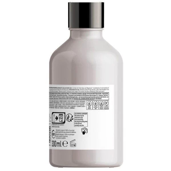 Shampooing Silver L’Oréal Professionnel, l’alliance incroyable de pigments violets et de magnésium acétate pour neutraliser les reflets jaunes des cheveux gris.
