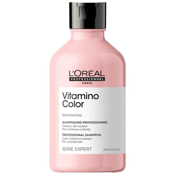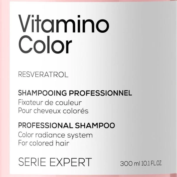 Vitamino color est conçu pour répondre aux besoins des cheveux colorés, le shampooing professionnel Vitamino Color Série Expert de L’Oréal Professionnel est formulé à base de Resveratrol, un fort polyphénol qui évite l’affadissement de la couleur et les dommages de la fibre capillaire suite à un service technique. Le Resveratrol garantie également une protection UV contre les rayons du soleil, souvent à l’origine de l’affadissement d’une coloration. La texture onctueuse et la mousse aérée du shampooing Vitamino Color feront de votre douche un réel moment détente.