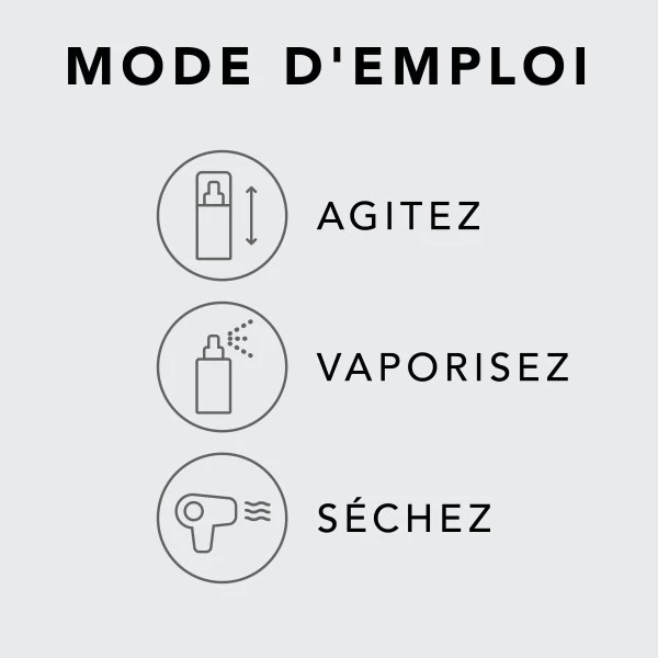- Vaporisez sur cheveux humides juste avant de les sécher au sèche-cheveux.